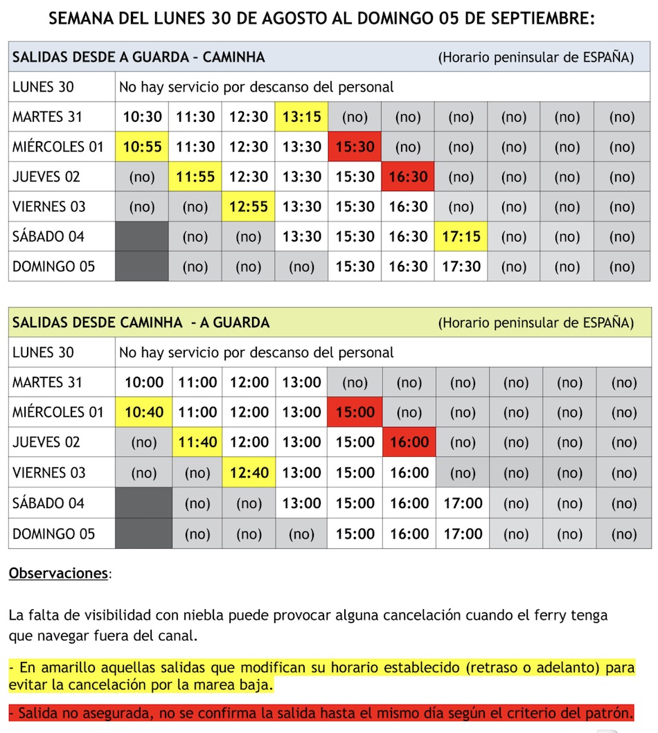 Esta semana las salidas del ferry se verán afectadas por la marea baja. Por lo tanto, se adjunta la tabla con los horarios hasta el domingo 05 de septiembre con las salidas confirmadas y aquellas que sufren alguna variación están marcadas.