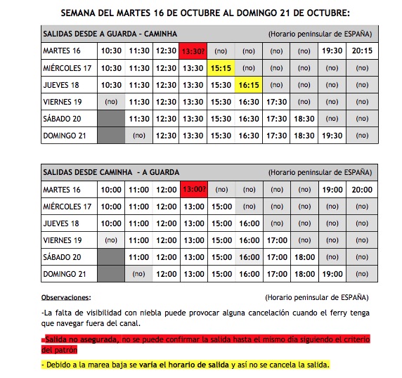Esta semana las salidas del ferry se verán afectadas por la marea baja. Por lo tanto, se adjunta la tabla con los horarios definitivos hasta el domingo 21 de octubre con las salidas confirmadas y aquellas que sufren alguna variación están marcadas.
