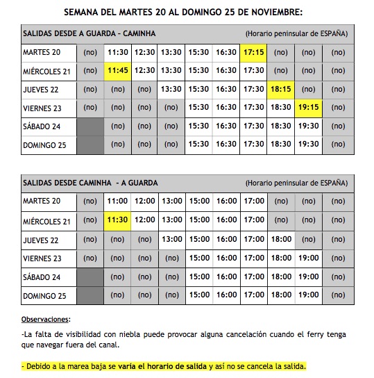Esta semana las salidas del ferry se verán afectadas por la marea baja. Por lo tanto, se adjunta la tabla con los horarios definitivos hasta el domingo 25 de noviembre con las salidas confirmadas y aquellas que sufren alguna variación están marcadas.