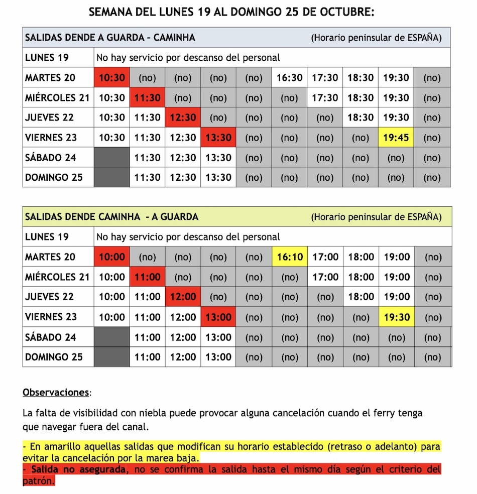 Esta semana las salidas del ferry se verán afectadas por la marea baja. Por lo tanto, se adjunta la tabla con los horarios confirmados hasta el domingo 25 de octubre con las salidas confirmadas y aquellas que sufren alguna variación están marcadas.