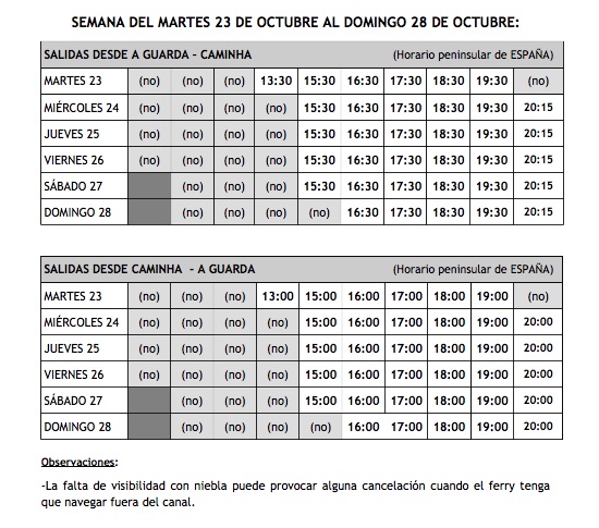 Esta semana las salidas del ferry se verán afectadas por la marea baja. Por lo tanto, se adjunta la tabla con los horarios definitivos hasta el domingo 28 de octubre con las salidas confirmadas y aquellas que sufren alguna variación están marcadas.