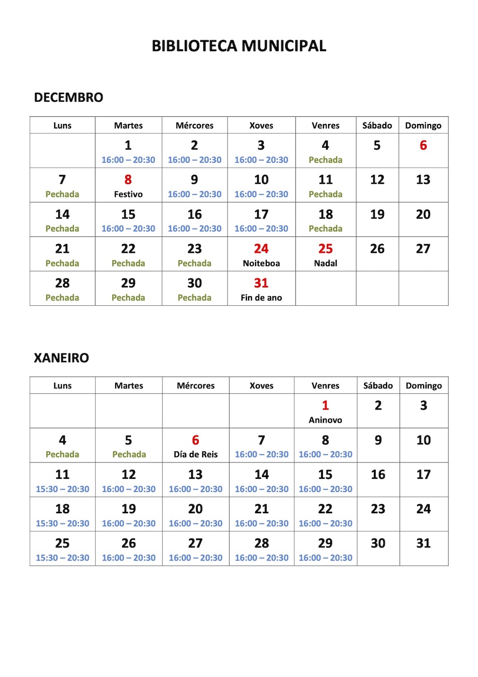 Desde el mismo día 7 de enero, la biblioteca retomará su horario habitual: los lunes de 15.30 a 20.30 horas y de martes a viernes de 16.00 a 20.30 horas.