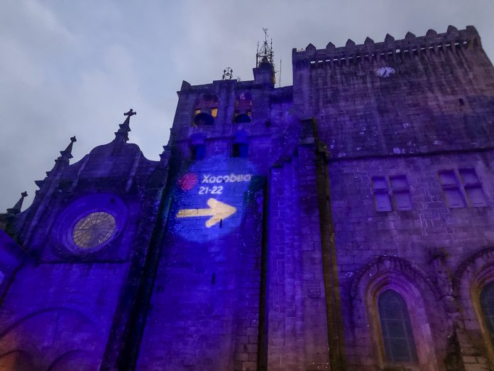 La fachada norte de la Catedral de Tui permanece a lo largo de estas fiestas navideñas, hasta este jueves 6 de enero, iluminada con el logotipo de la celebración del Xacobeo 2021-2022, en una iniciativa promovida por la Xunta de Galicia de iluminación de los lugares más emblemáticos de los Caminos de Santiago en Galicia.