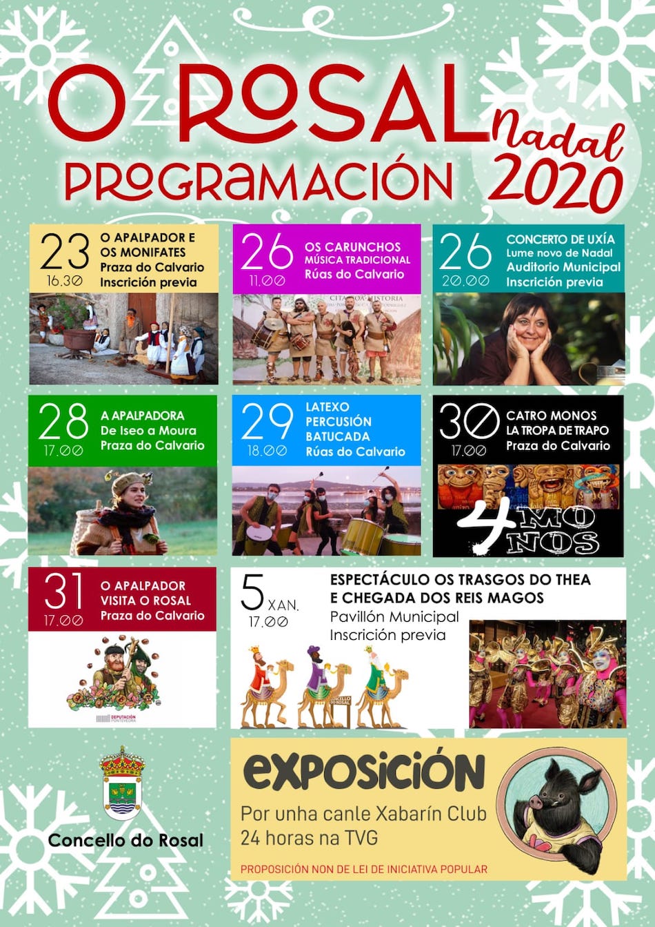El Salón de Exposiciones del Concello de O Rosal, acoge hasta el próximo mes de enero la muestra ¡Asina! Por unha canle Xabarín Club 24 horas na TVG’, una exposición creada por el alumnado del CEIP A Guía de Moaña al amparo de la campaña de la Mesa por la Normalización Lingüística para poner en marcha una proposición parlamentaria por iniciativa popular con la que conseguir un canal con programación dirigida al público infantil y juvenil, que garantice un canal en gallego con contenidos atractivos, de éxito actuales y pasados, educativos y de producción gallega.