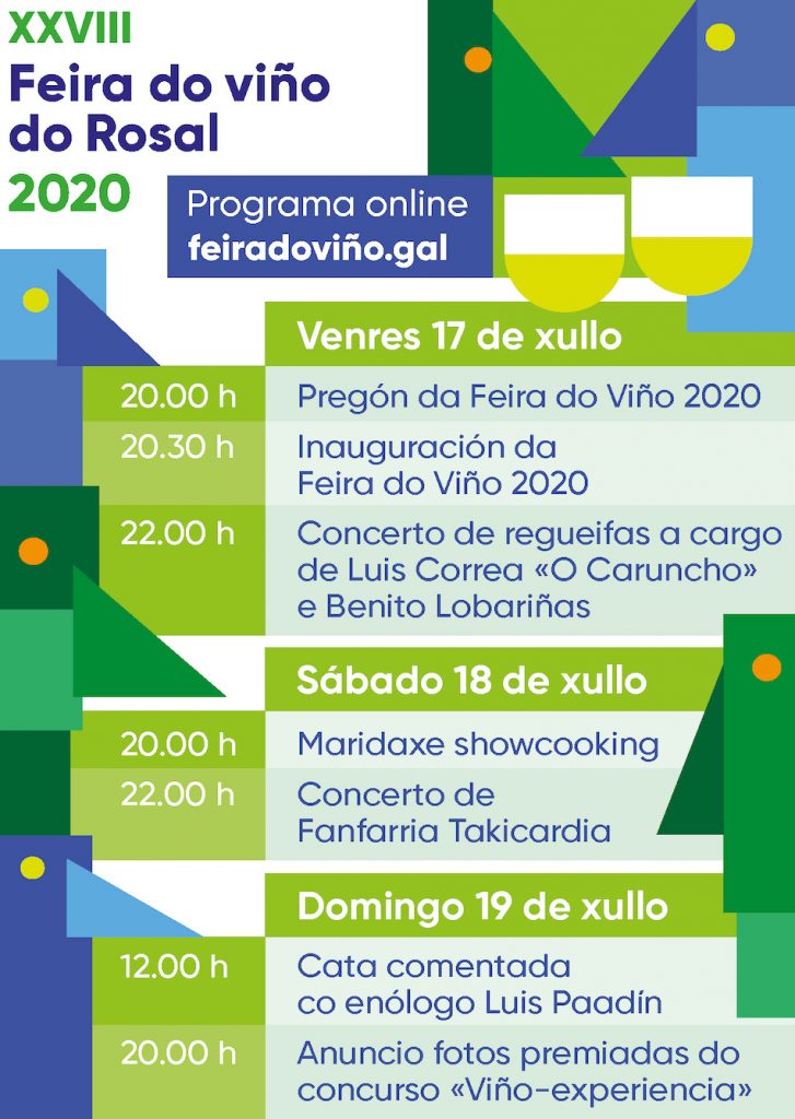 La “Feira do Viño” de O Rosal estrena página web. Desde hoy mismo el público podrá informarse y disfrutar de todo lo que acontece y acontecerá en la XXVIII edición de la feria a través de Feiradoviño, una página que articulará toda la programación virtual y la propia tienda online en la que se podrán comprar a los mejores precios vinos con D.O. Rías Baixas subzona O Rosal de las bodegas Aforado, Aldea de Abaixo, Altos de Torona, Lagar de Cerveira, Pedregales, Quinta Couselo, Santiago Ruiz, Terras Gauda y Val Miñor.