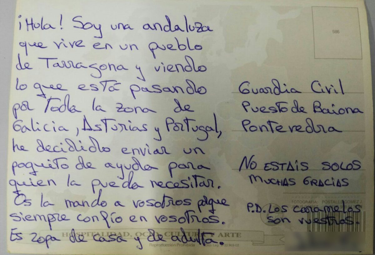 El remitente, en una nota manuscrita que acompaña al envío, se identifica como una persona de origen andaluz y residente en la Comunidad Autónoma de Cataluña. Se dirige a la Guardia Civil de Baiona para canalizar la entrega de un lote de ropa y así poder hacérsela llegar a las personas que pudieran necesitarlo a raíz de los incendios sufridos en la provincia la pasada semana.