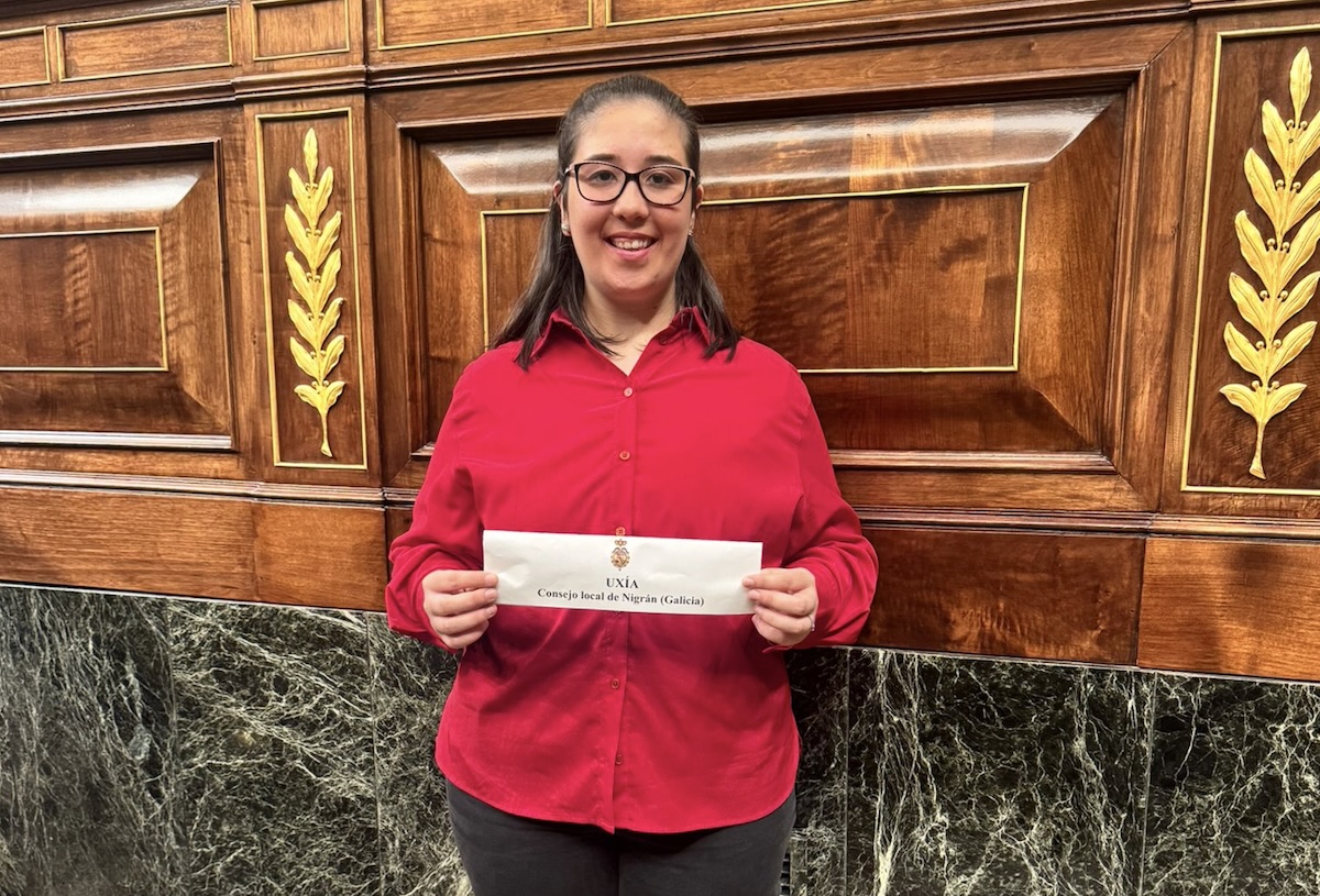 La joven de Nigrán Uxía Fernández, de 16 años, usuaria del centro Juan María y miembro de la Xeneración Xa del Concello de Nigrán, participó hoy en el Congreso de los Diputados, donde tuvo la oportunidad de leer un discurso en el marco de la octava edición de Infancia en el Congreso, una iniciativa impulsada por la Plataforma de Infancia y UNICEF España.