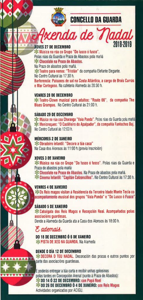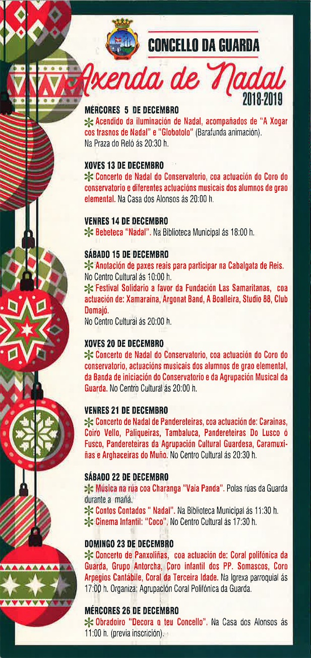 La Navidad llega A Guarda con una extensa y variada programación de actividades que se presentaron esta mañana por parte de la Concejal de Cultura, Elena Baz; el Alcalde de A Guarda, Antonio Lomba y la Concejal de Turismo, Montserrat Magallanes.