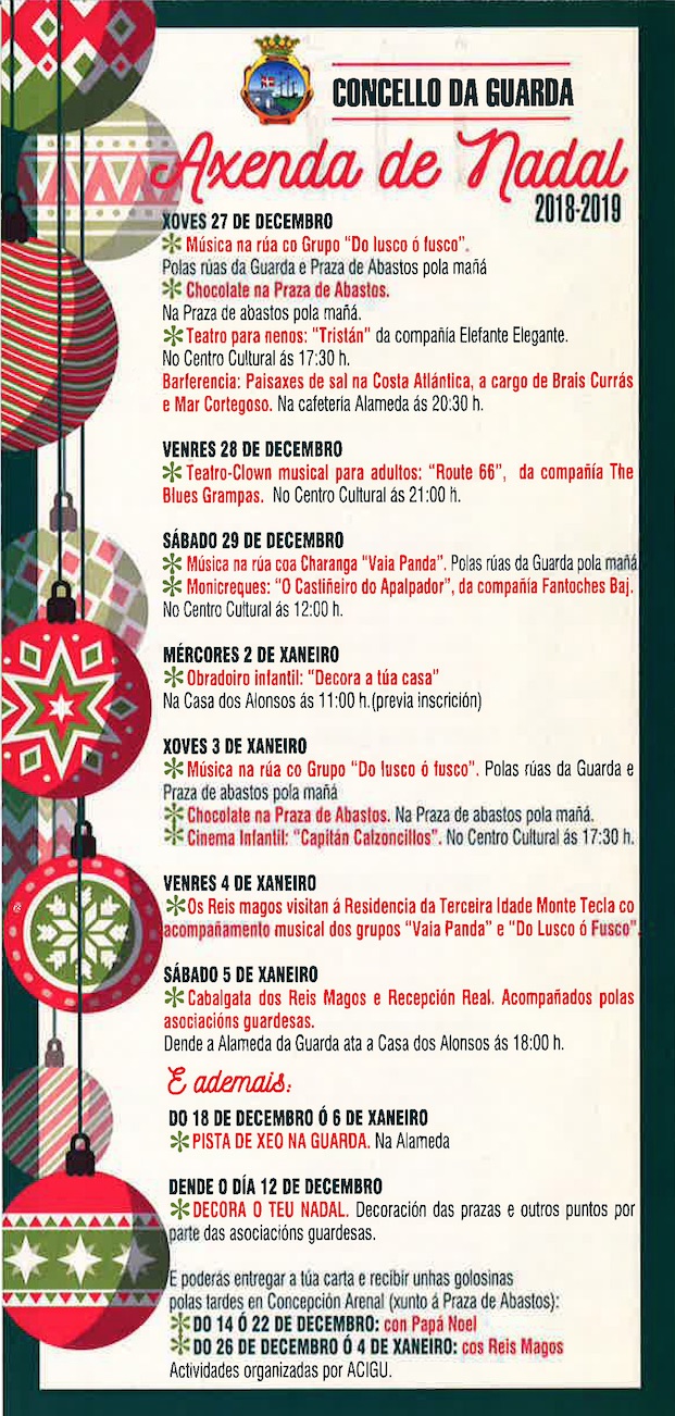 Teatro, animación musical por las calles, conciertos de villancicos, talleres de decoración, chocolatadas, pista de hielo, o la Cabalgata de Reyes, son algunas de las actividades previstas desde el 5 de diciembre hasta el 6 de enero, un mes en el que A Guarda vivirá en la magia navideña.