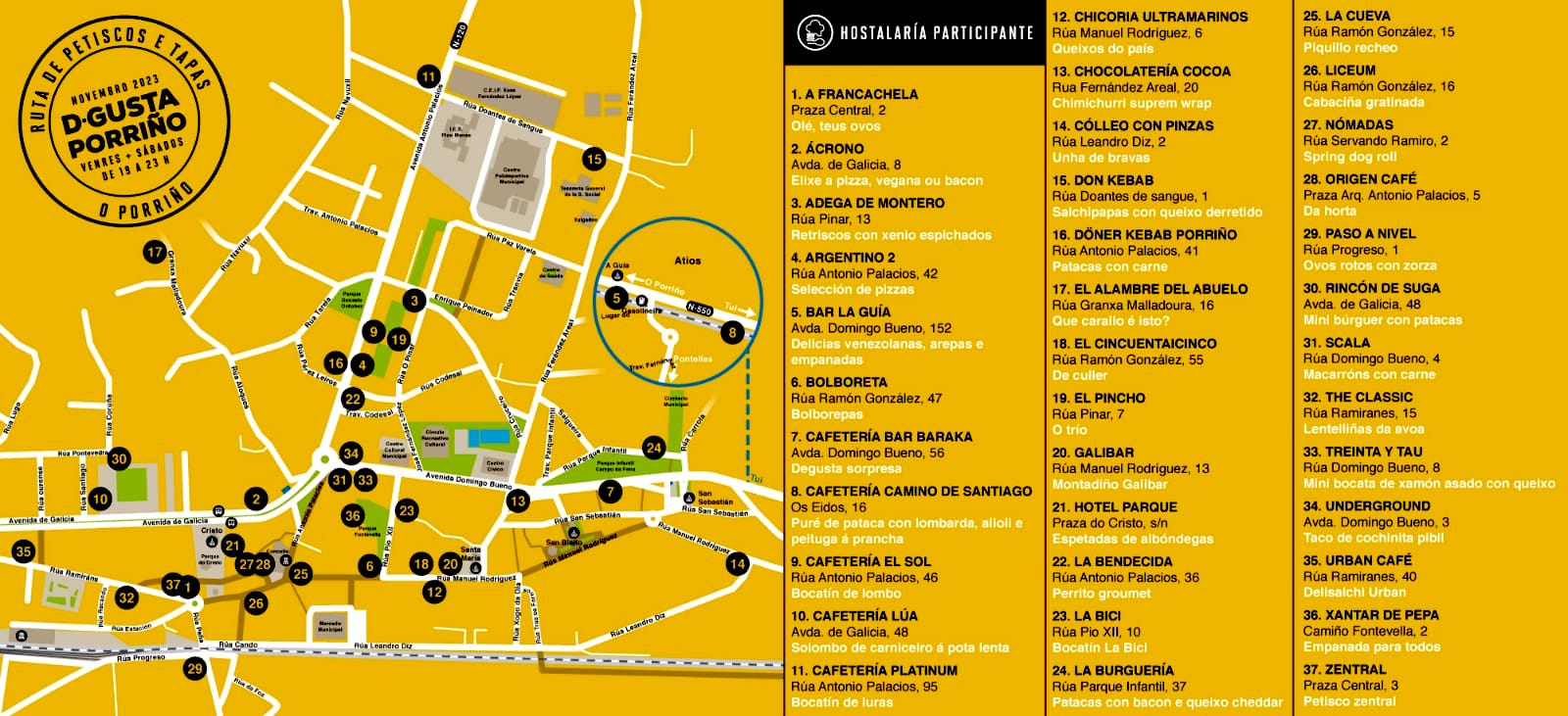 Organizada por la Asociación de Hostaleros de O Porriño (Ahospor) en colaboración con el Concello, “D-Gusta Porriño” suma en esta segunda edición 37 locales participantes, que ofrecerán sus creaciones culinarias al precio simbólico de 1 euro los viernes y sábados del mes de noviembre de 19:00 a 23:00 horas.