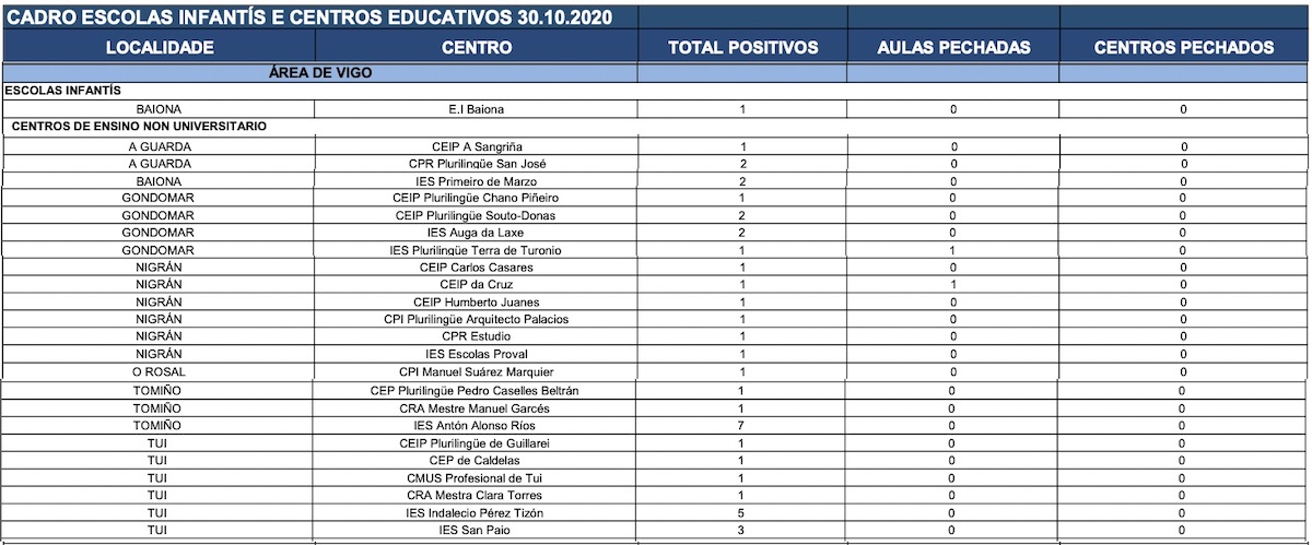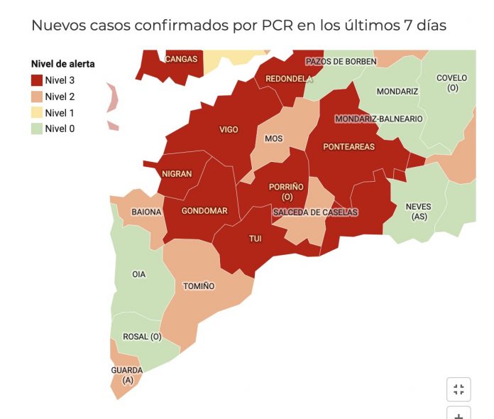 La pandemia sigue aumentando también en O Baixo Miño y en O Val Miñor. Gondomar, Tui y Nigrán, con un trabajador de la residencia de mayores Bellavista Care con Covid, están en alerta roja con más de 21 casos confirmados. Baiona, Tomiño y A Guarda están en nivel naranja, con entre 14 y 21 casos confirmados de coronavirus en el municipio. Por su parte, en Oia y O Rosal no se han confirmado casos de Covid-19.