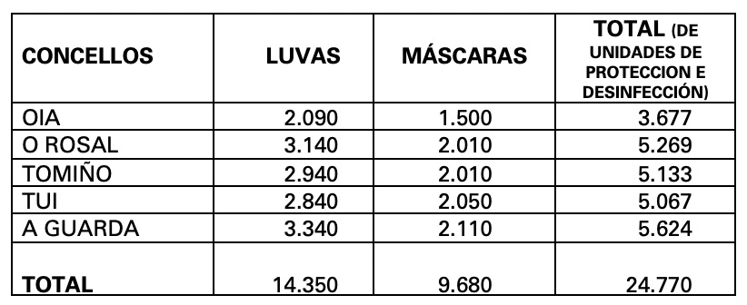 Por Concellos, los envíos totales de unidades de protección son los siguientes: