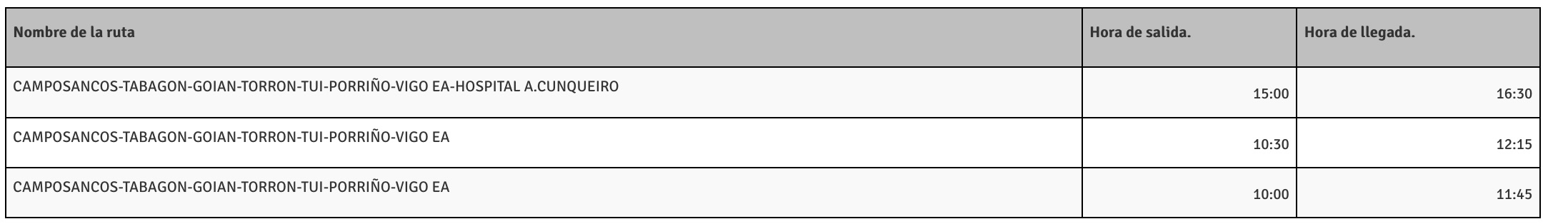 En el siguiente cuadro se muestran los horarios de los nuevos servicios, que incrementan la frecuencia de paso de los autobuses entre Baiona y Vigo, lo que permite reducir los tiempos de espera.