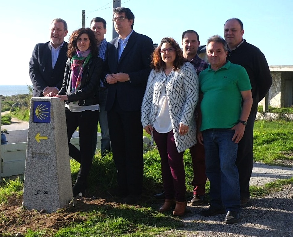El delegado territorial de la Xunta en Vigo, Ignacio López-Chaves, y el gerente del Xacobeo, Rafael Sánchez Bargiela, junto a la alcaldesa del Concello de Oia, Cristina Correa, y varios miembros de su equipo de gobierno, asistieron esta tarde a la colocación de uno de los primeros mojones oficiales que señalizan el Camino Portugués de la Costa a su paso por el municipio en el entorno del Mosteiro de Santa María de Oia.