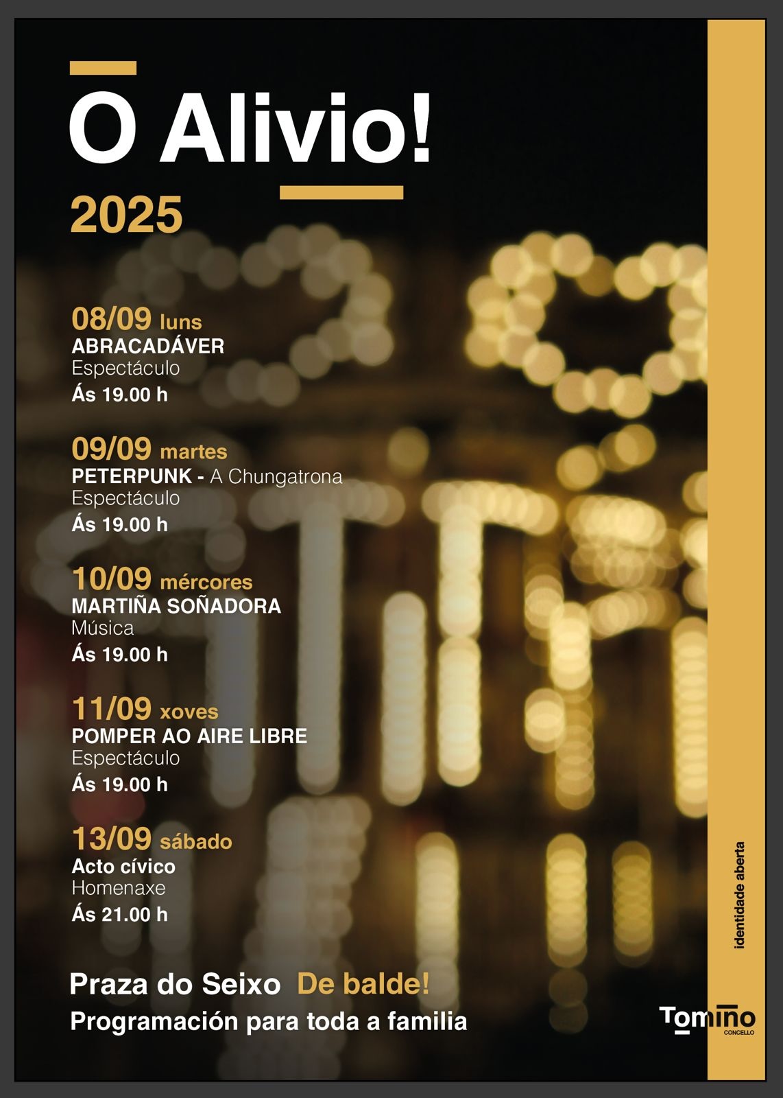 Tomiño se prepara para vivir uno de los momentos más esperados del año, las Festas do Alivio, que del 8 al 13 de septiembre transformarán la Praza do Seixo en un escenario abierto a la música, el circo, el teatro y la diversión. La programación, gratuita y pensada para todas las edades, culminará el sábado 13 a las 21:00 horas con el tradicional Acto Cívico do Alivio.