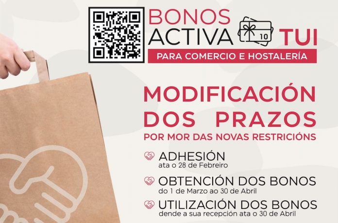 El 30 de abril finaliza el plazo para solicitar y consumir los cerca de 1.600 bonos “Activa Tui” aún disponibles de la campaña puesta en marcha por el Concello tudense, quien destina a este fin 50.000 euros distribuidos en 5.000 bonos de consumo de 10 euros para canjear en compras superiores a 25 euros en los 67 establecimientos participantes. Las personas de Tui, o de cualquier otro Concello, mayores de 16 años, pueden solicitar hasta dos bonos en Activa Tui.