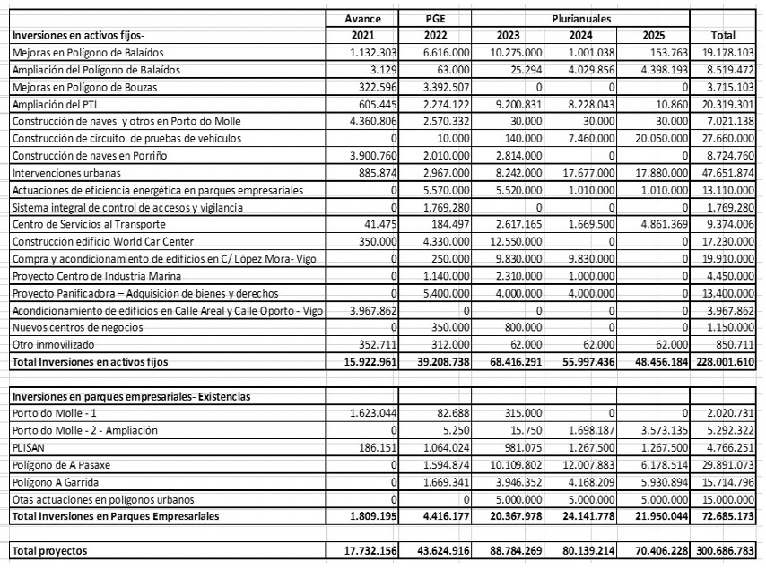 En varias actuaciones se puede apreciar en los presupuestos plurianuales que en 2022 se comienza con pequeñas partidas como simiente y preparación de grandes obras que luego llegan a requerir grandes inversiones como es el caso del Circuito de Pruebas, las nuevas instalaciones de López Mora, el Centro de Servicios al Transporte o la ampliación prevista para Porto do Molle. Como declaró David Regades, “el efecto de las inversiones previstas permitirá un fortalecimiento de nuestro sector industrial y el necesario crecimiento del empleo para superar los golpes recibidos por la pandemia”.