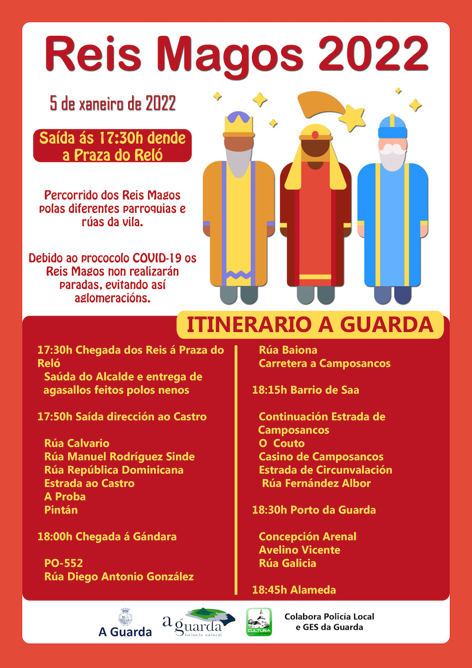 Debido al protocolo COVID-19 los Reyes Magos no realizarán paradas, evitando así aglomeraciones. Desde el Concello de A Guarda se pide a la población que evite espacios de gran afluencia y que se cumplan con las medidas sanitarias.