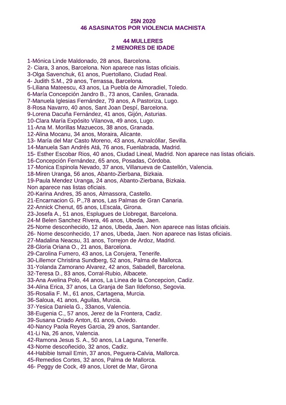 Este ano foron asasinadas no estado, pola violencia machista, 43 mulleres, 2 delas en Galiza, e tres nenos. Continúase a deixar fóra das listas oficiais a mulleres que non son asasinadas polas súas parellas e tamén quedan fóra ás fillas e fillos asasinados.