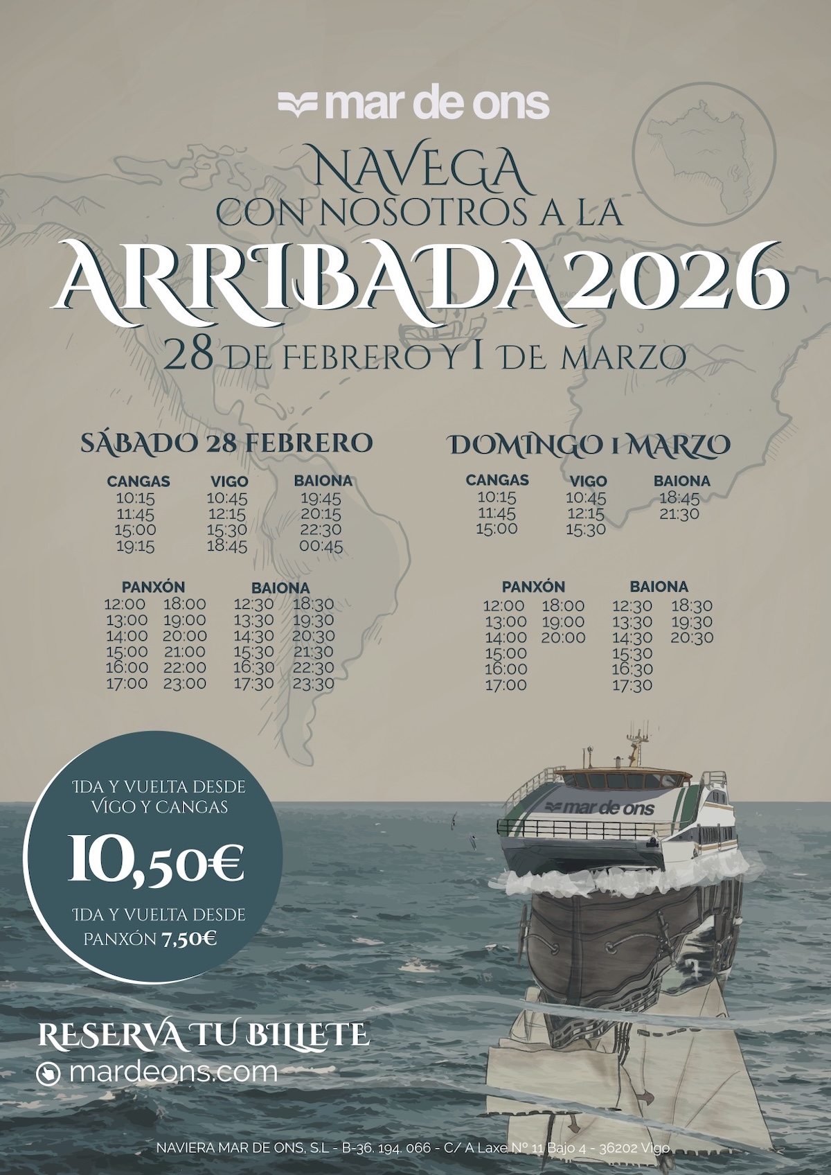 Con motivo de una nueva edición de la Festa da Arribada, Mar de Ons vuelve a apostar por el transporte marítimo como la forma más cómoda y sostenible de acceder a Baiona durante uno de los eventos más multitudinarios y emblemáticos de Galicia, que se celebrará los días viernes 27 (no hay servicio) y sábado 28 de febrero y domingo 1 de marzo.