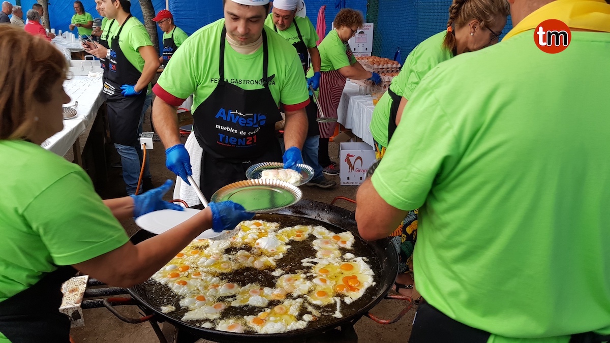 Tres grandes paelleras llenas de aceite escoltadas por más de una docena de cocineros sirvieron de sartenes para freír los chorizos y los huevos, mientras que los camareros servían en platos de cartón las raciones que los asistentes se encargaron de degustar.