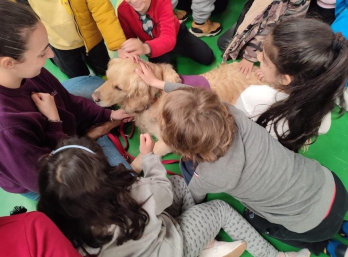 El Concello do Porriño, a través de la concejalía de Educación y la OMIX, está desarrollando en los centros educativos los talleres de educación en valores asistidos por perros de terapia «Ladrando ladrando a clase pasa voando”.