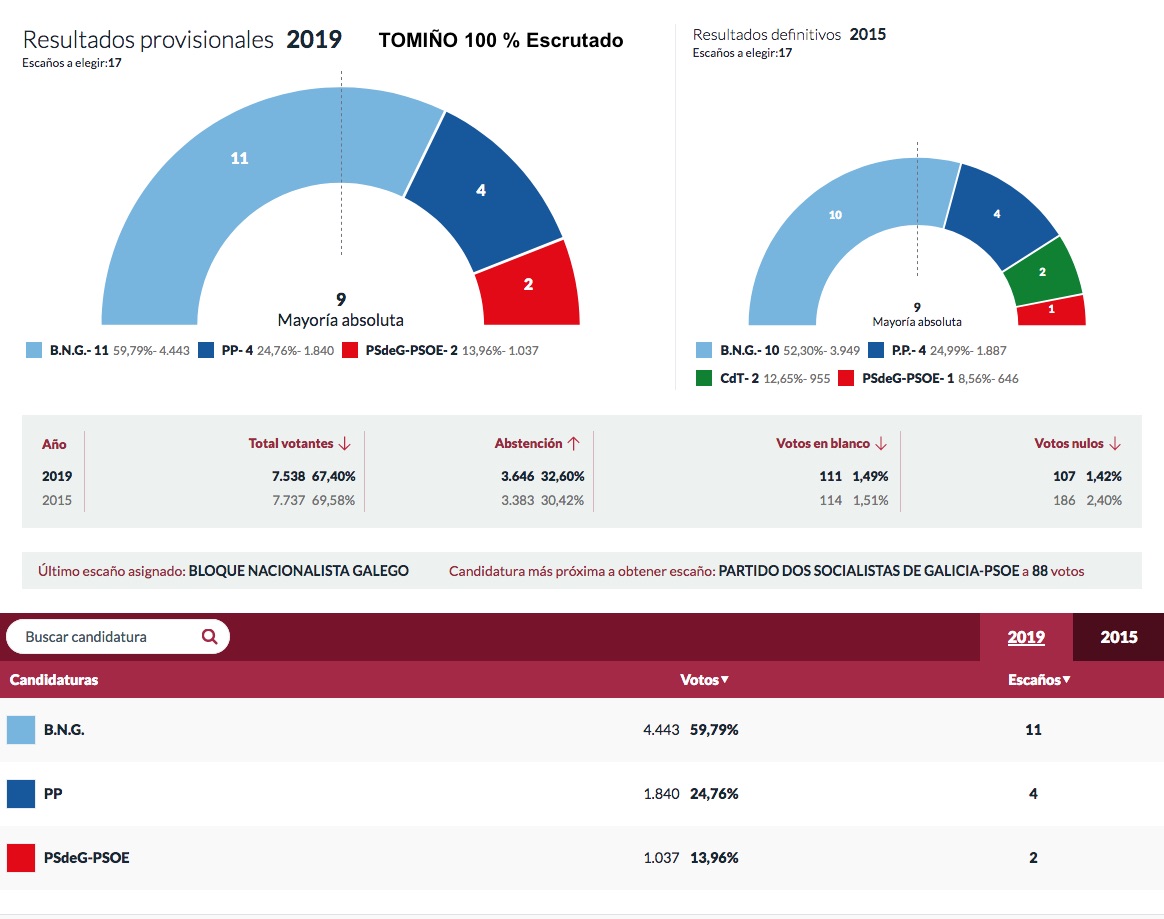 González ha obtenido casi el 60 % de los votos y once ediles, uno más que en el 2015 con 4.443 votos. Tras el BNG, los populares obtienen de los tomiñeses 1.840 papeletas y el PSdeG-PSOE 1.037 votos.