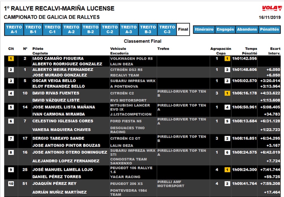 “Llegamos a la tercera pasada por Xove con once segundos de ventaja, pero cometimos dos errores en los cuales perdimos bastante tiempo. Primero nos salimos rectos en un cruce y el coche se apagó en el momento de dar marcha atrás, y después nos volvimos a salir en una zona sucia. En estos lances dañamos un brazo de la suspensión delantera, siendo imposible defender el liderato en el último tramo. Es una lástima no haber podido refrendar el triunfo para terminar la temporada, pero estamos contentos con el ritmo demostrado”,comentó el piloto de Vincios.