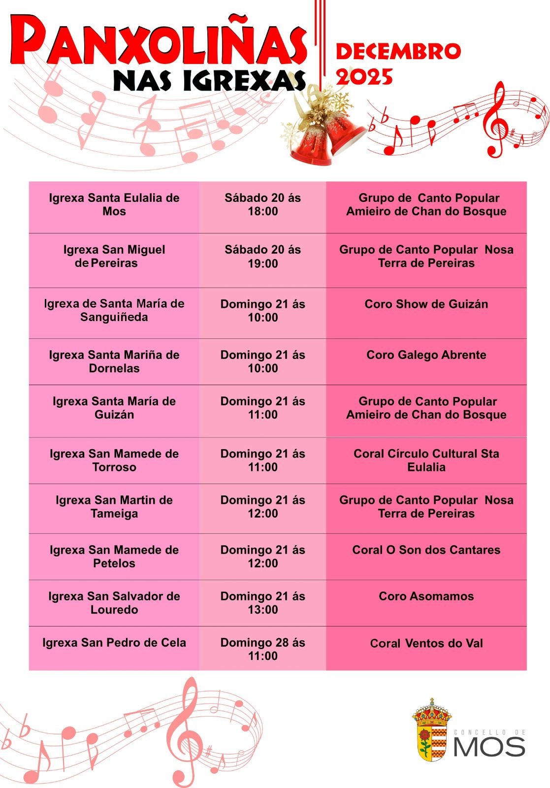 El programa se desarrollará los días 20, 21 y 28 de diciembre y contará con la participación de corales y grupos de canto popular de Mos, que interpretarán panxoliñas y canciones tradicionales, manteniendo viva una de las expresiones culturales más arraigadas de estas fechas y favoreciendo, al mismo tiempo, la convivencia y el encuentro entre generaciones.