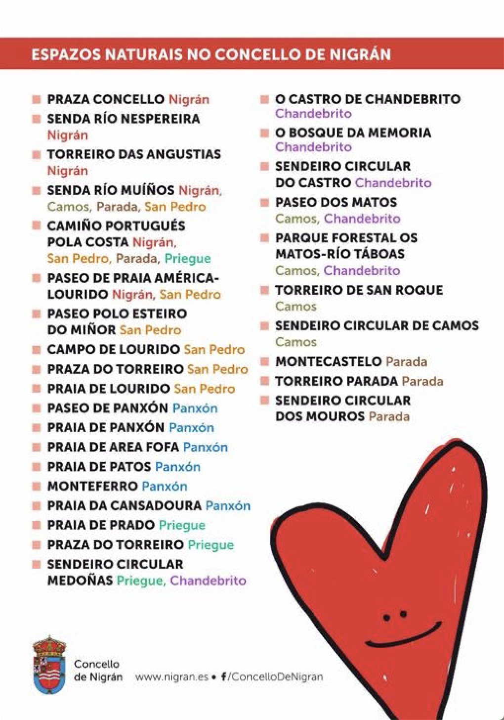 Mediante una cartelería específica el Concello recopila senderos, plazas o playas abiertas a este uso incidiendo siempre que sólo podrán ser empleados cumpliendo con los requerimientos que establece el Ministerio de Sanidad, así lo controlará la Policía Local, que vigilará que no se sobrepasar en ningún caso el ratio de 1 km desde la casa familiar y también que a la playa no se acceda con perros.
