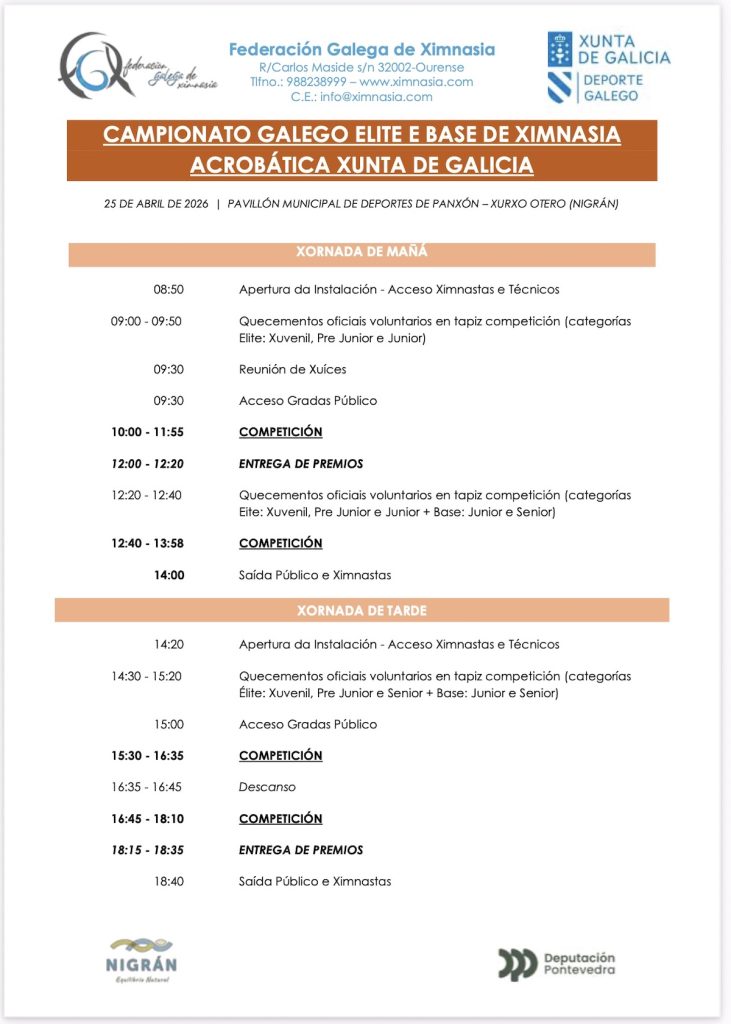 El Concello de Nigrán se prepara para acoger este sábado 25 una de las citas más destacadas del calendario deportivo autonómico, el Campeonato Gallego Base y Absoluto de gimnasia acrobática.