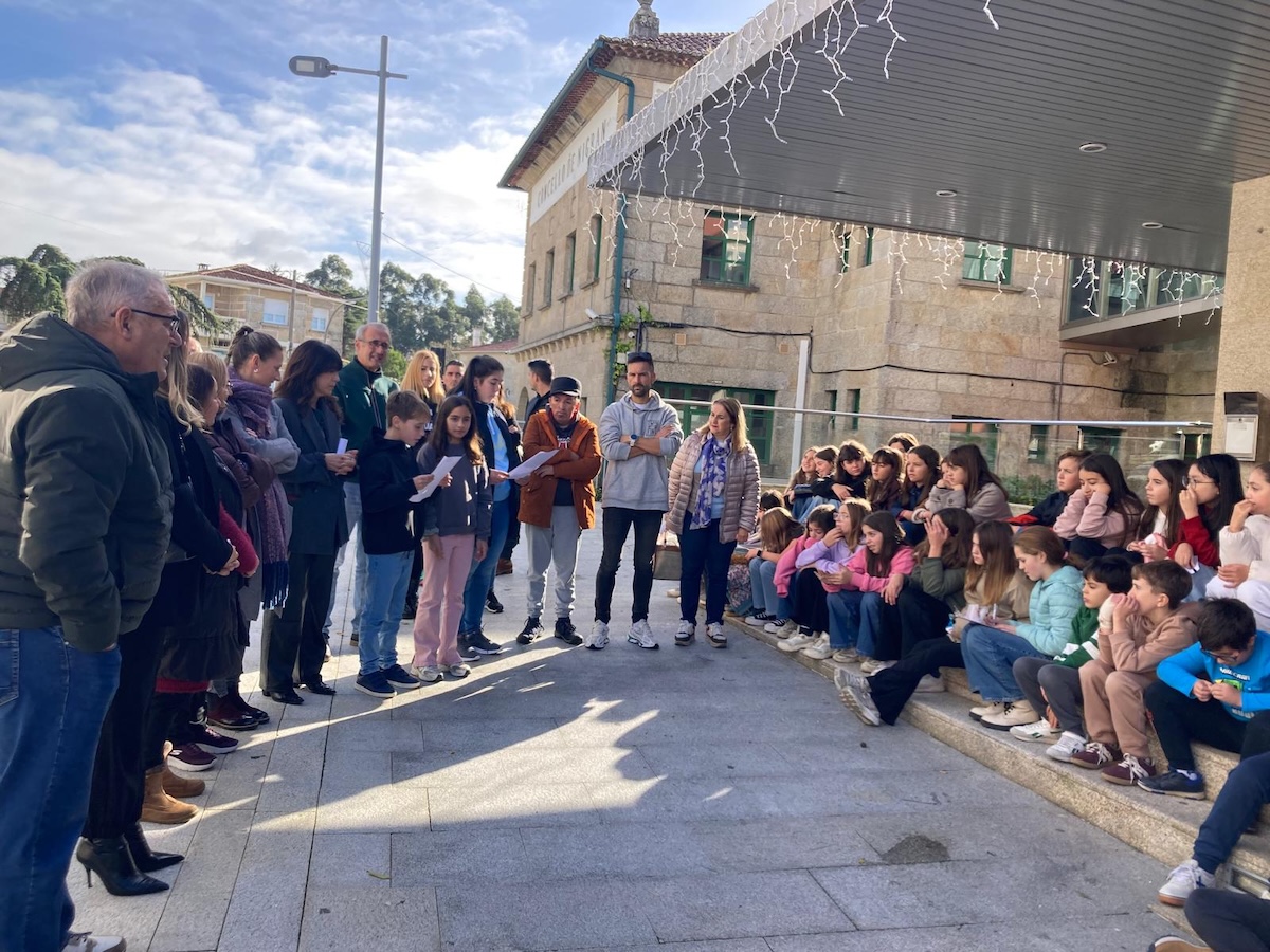 El mediodía en la Praza do Concello estuvo marcado por las voces más jóvenes. Tres portavoces de la Xeración Xa! leyeron un emotivo manifiesto dedicado a las víctimas de violencia vicaria. “Queremos medrar nun mundo onde o amor non fira, onde o coidado sexa forza, onde a vida sexa segura, tamén dentro da casa”, proclamaron antes de cerrar con el grito colectivo: “Nin unha menos!”. Tras la lectura, alumnado de 6º de Primaria del CEIP Humberto Juanes y del CEE Juan María, junto con representantes municipales, guardaron un minuto de silencio en memoria de todas las víctimas de violencia de género.