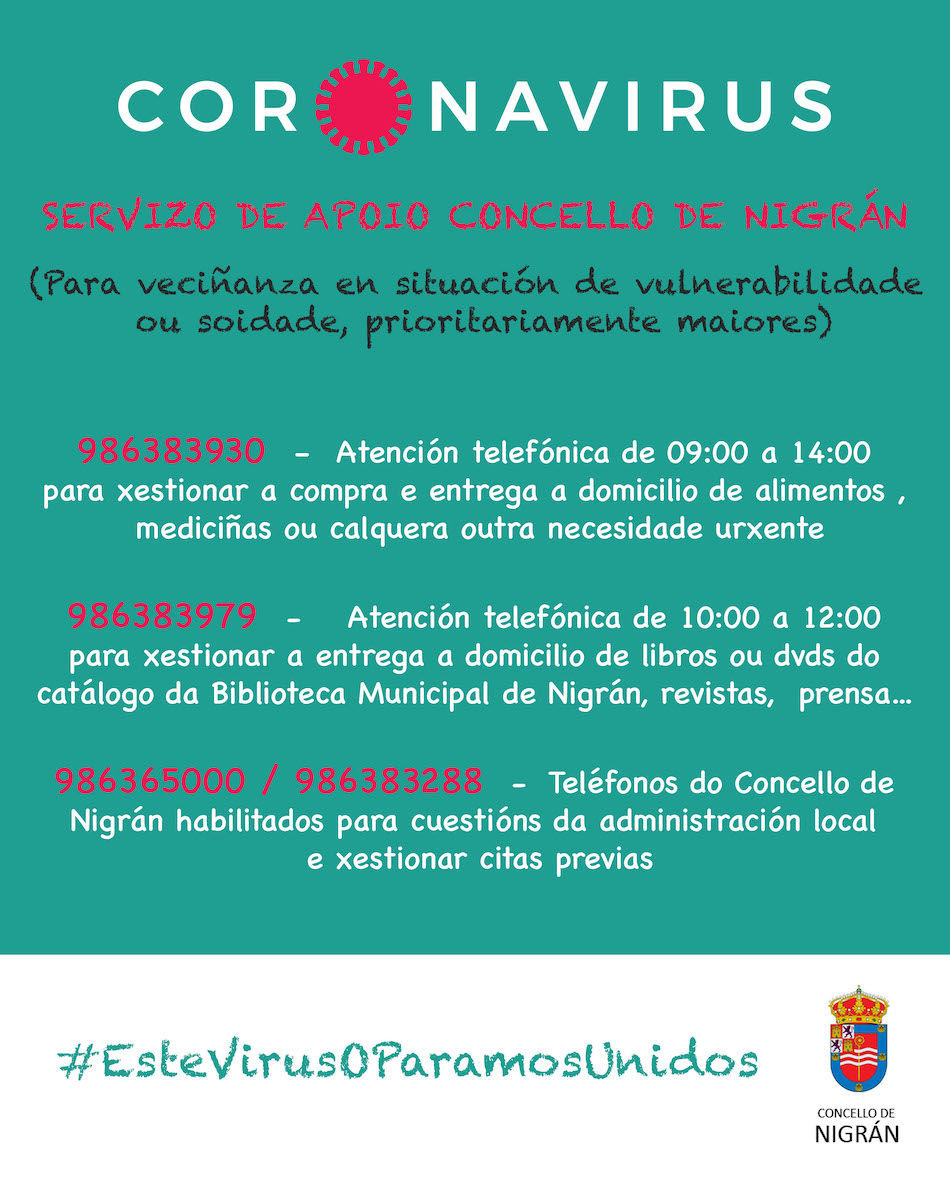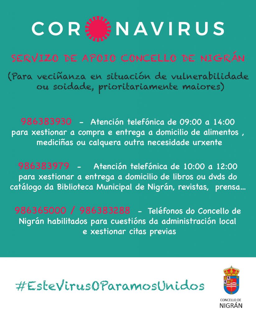 Así, el Concello facilita ya la línea telefónica oficial 986383930 (operativa de 9:00 a 14:00 horas) con el objetivo de gestionar la compra y entrega a domicilio de medicamentos y alimentos. Para requerir el préstamo a domicilio de alguna publicación del catálogo de la Biblioteca Municipal o revistas, prensa… el teléfono de contacto es el de la propia Biblioteca (986383979) de 10:00 a 12:00 horas (igualmente, el Ayuntamiento anula hasta nuevo aviso el plazo de devolución de préstamo de libros para aquellas personas que actualmente tienen alguno). En ambos casos (alimentos o publicaciones) el reparto a domicilio es para personas en especial riesgo, en soledad o sin medios ante el Covid-19.