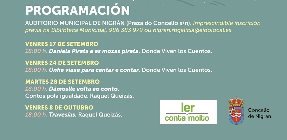 El Concello de Nigrán, a través de la Biblioteca Municipal, ofrece semanalmente desde este viernes en el Auditorio Municipal y hasta el 8 de octubre cuatro cuentacuentos infantiles a través del programa de dinamización a la lectura “Ler conta Moito”. Por cuestiones de seguridad sanitaria, es imprescindible la inscripción previa para cada uno de ellos en la propia biblioteca, en el correo nigran.rbgalicia@eidolocal.es o en el 986 383 979.