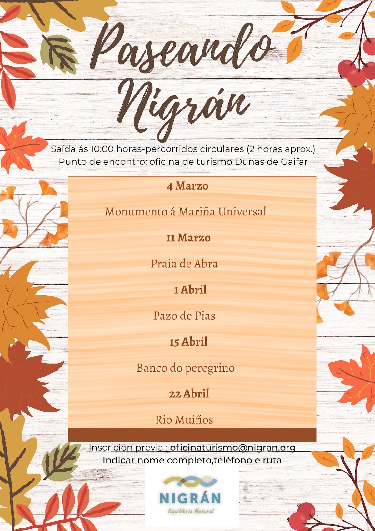 Todas las rutas serán con salida a la misma hora, circulares y con duración similar, siempre mediante inscripción previa en oficinaturismo@nigran.org (indicando nombre y apellidos, teléfono y día de la ruta en la que se anotan). Se recomienda acudir siempre con ropa cómoda, calzado adecuado para caminar y una botella de agua. La información concreta sobre cada andaina está colgada en la web municipal.