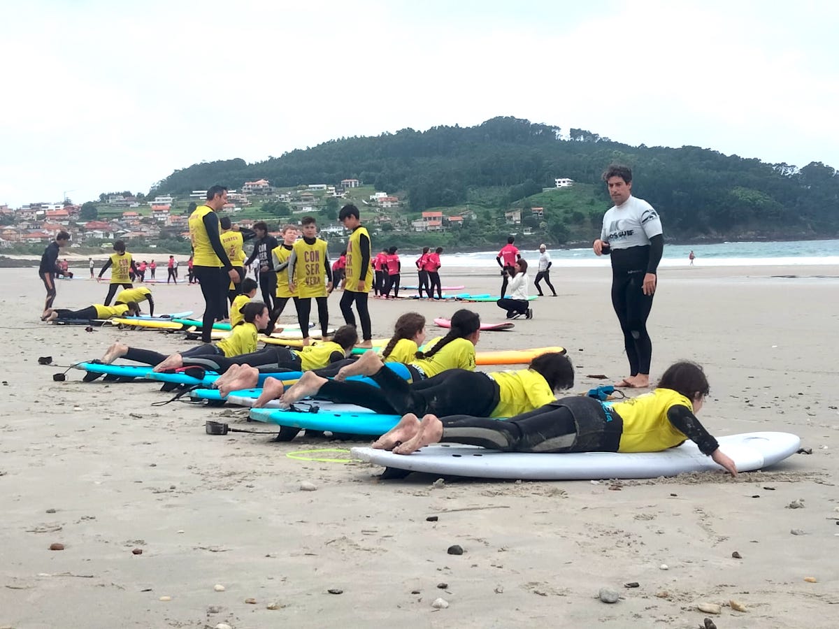 Más de 220 alumnos participan estos días en la actividad Re-Coñecéndonos: Bautismo de Surf, organizada por el Concello do Porriño, a través de la Concejalía de Sanidad y la OMIX con el objetivo de promover entre la juventud hábitos de vida saludable.