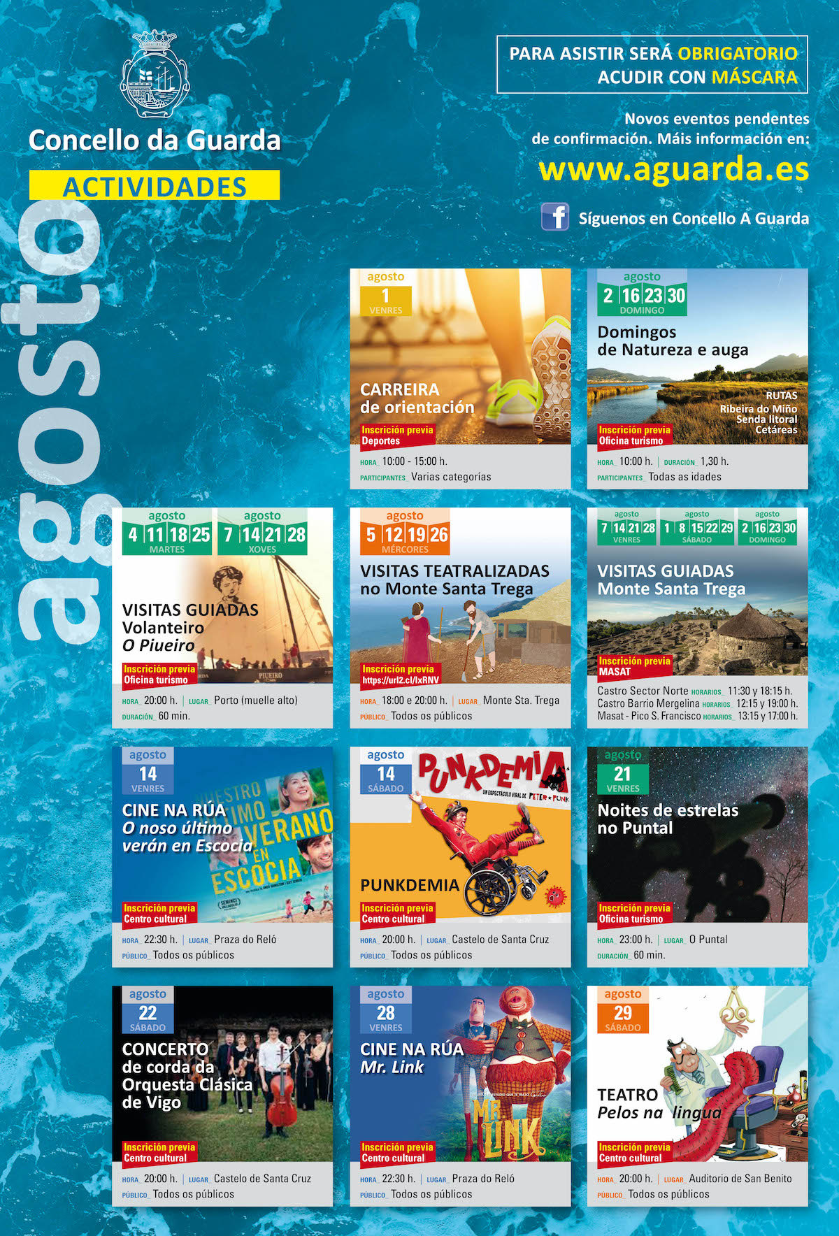 El Concello de A Guarda continúa apostando por una programación de actividades para todos los gustos y edades, teniendo siempre en cuenta las medidas de higiene y seguridad motivadas por la pandemia del covid-19.