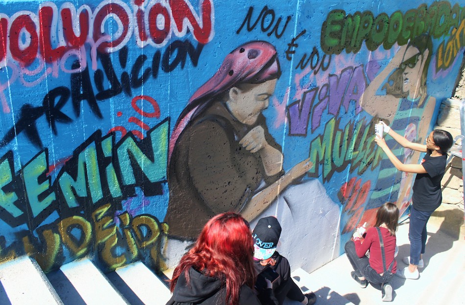 Dende primeira hora da mañá, un grupo de rapazas de distintos cursos fixeron uso dos aerosois para embelecer os muros das escaleiras que dan acceso ao aparcadoiro da Alameda, axudados polo graffiteiro Pow Catro horas bastaron ás noveis artistas para decorar as paredes con imaxes de mulleres e mensaxes feministas como «Non é non».