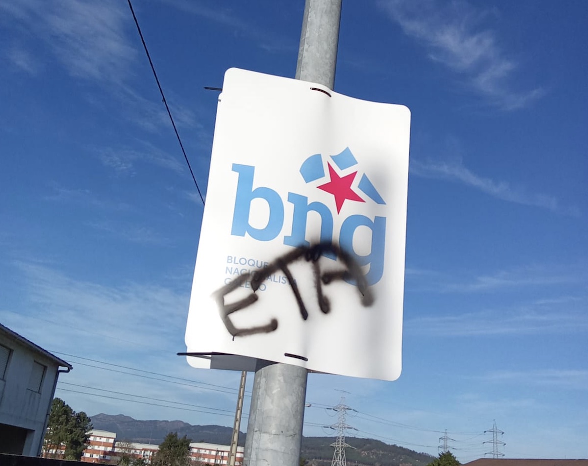 Desde o comezo da campaña aparece cada día arrincada a cartelaría do Bloque dos taboleiros electorais. Tamén teñen desaparecido bandeirolas das farolas e téñense vandalizado outras, pintadas por riba coa palabra ETA, aseguran os nacionalistas.