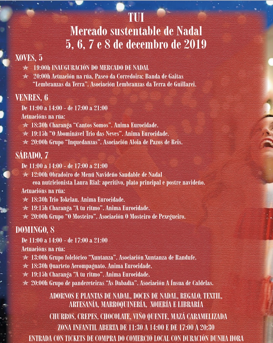 A inauguración do Mercado está prevista para o xoves, 5 de decembro, ás 19 h. A partir de aí comeza un amplo programa de actividades que até o domingo contempla actuacións musicais e unha ludoteca infantil. O venres, sábado e domingo os postos abrirán de 11 a 14 h e de 17 a 21 h. Os tres días contarase cunha Ludoteca Infantil en horario de 11.30 h a 14 h e de 17 a 20.30 h no que os nenos e nenas presentando un tícket de compra do comercio local poderán participar en obradoiros de reciclaxe, cociña, actividades creativas, espectáculos de maxia.