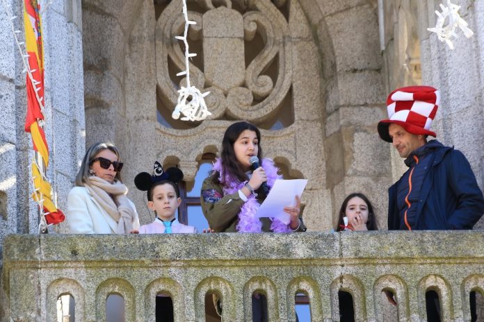 A las 13:00 horas se celebró el acto central de la mañana: el pregón del Carnaval, a cargo de Carla Marqués Vaquero, alumna de 4º de la ESO del Colegio Santo Tomás y ganadora del concurso de carteles en la categoría de Secundaria. El pregón se desarrolló en el balcón de la Casa Consistorial, donde Carla estuvo acompañada por los otros escolares premiados, resaltando el talento y la creatividad de la juventud porriñesa.