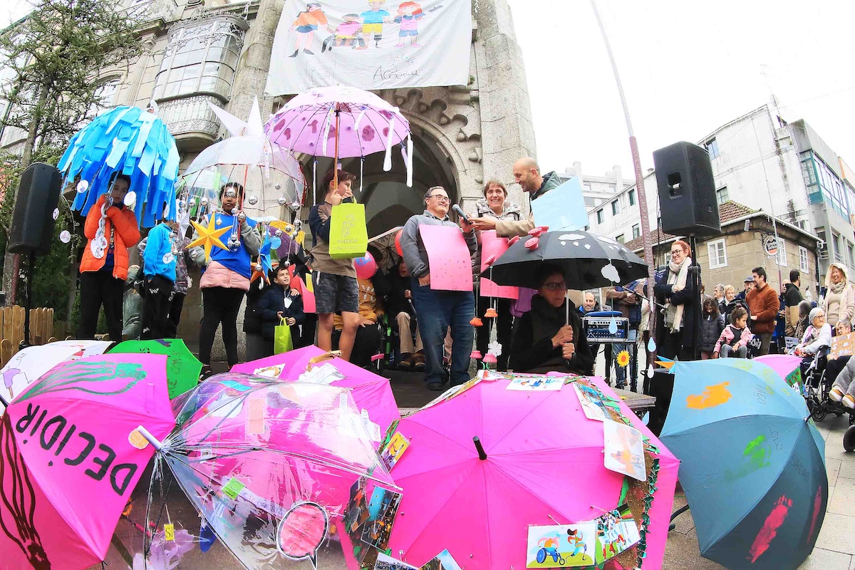 La jornada comenzó con una caminata por el centro de la villa a la que se sumaron cientos de escolares del municipio así como usuarios del centro de día y de AFAGA. Ya en la plaza del Concello se celebró el tradicional concurso de paraguas. Cada uno de los centros participantes decoraron un paraguas reivindicativo y fue un jurado de Aceesca quien otorgó los premios. Esta vez, el ganador fue el colegio Hermanos Quiroga, seguido del de Aceesca y del colegio Antonio Palacios.