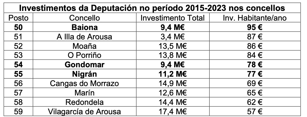 Así, e baseándose nos datos facilitados pola propia ex presidenta, Carmela Silva, Nigrán foi o quinto concello que menos investimento por habitante a Deputación durante os seus oito anos de mandato; Gondomar situouse inmediatamente despois na sexta praza pola cola; e Baiona ocupou o posto décimo. Neses datos a anterior mandataria obviou as contías recibidas polas dúas cidades de Vigo e Pontevedra.
