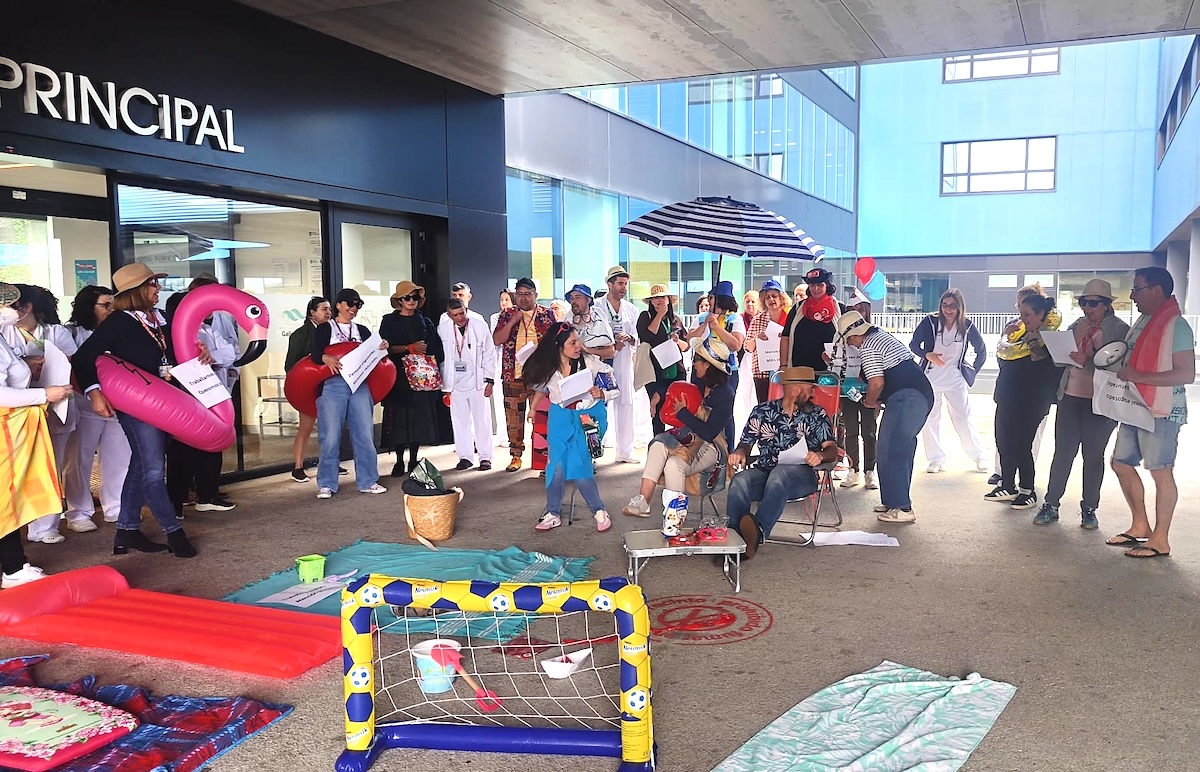 Durante a protesta, que se celebrou na porta principal do hospital ao mediodía, escenificouse un día de praia con vestimenta e obxectos propio do período estival.