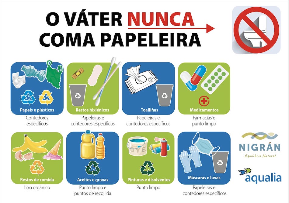 El Concello de Nigrán y Aqualia han puesto en marcha en el municipio una campaña de sensibilización bajo el título ‘El váter nunca como papelera’ para concienciar a los ciudadanos sobre el cuidado y uso acomodado de la red de saneamiento.