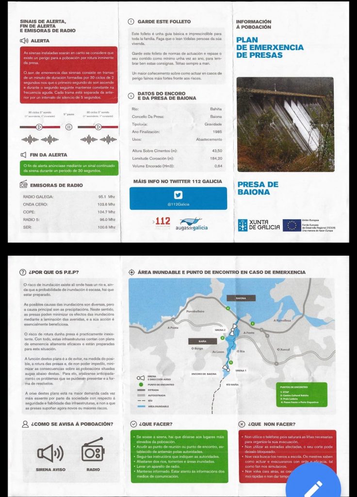 Este lunes, a las 17:30 horas, el Concello de Baiona organiza en el Centro Cultural de Baíña, una charla sobre el plan de emergencia del embalse que será impartida por Augas de Galicia y el Servicio de Emergencias, para asesorar a los vecinos de las medidas a tomar ente una emergencia.