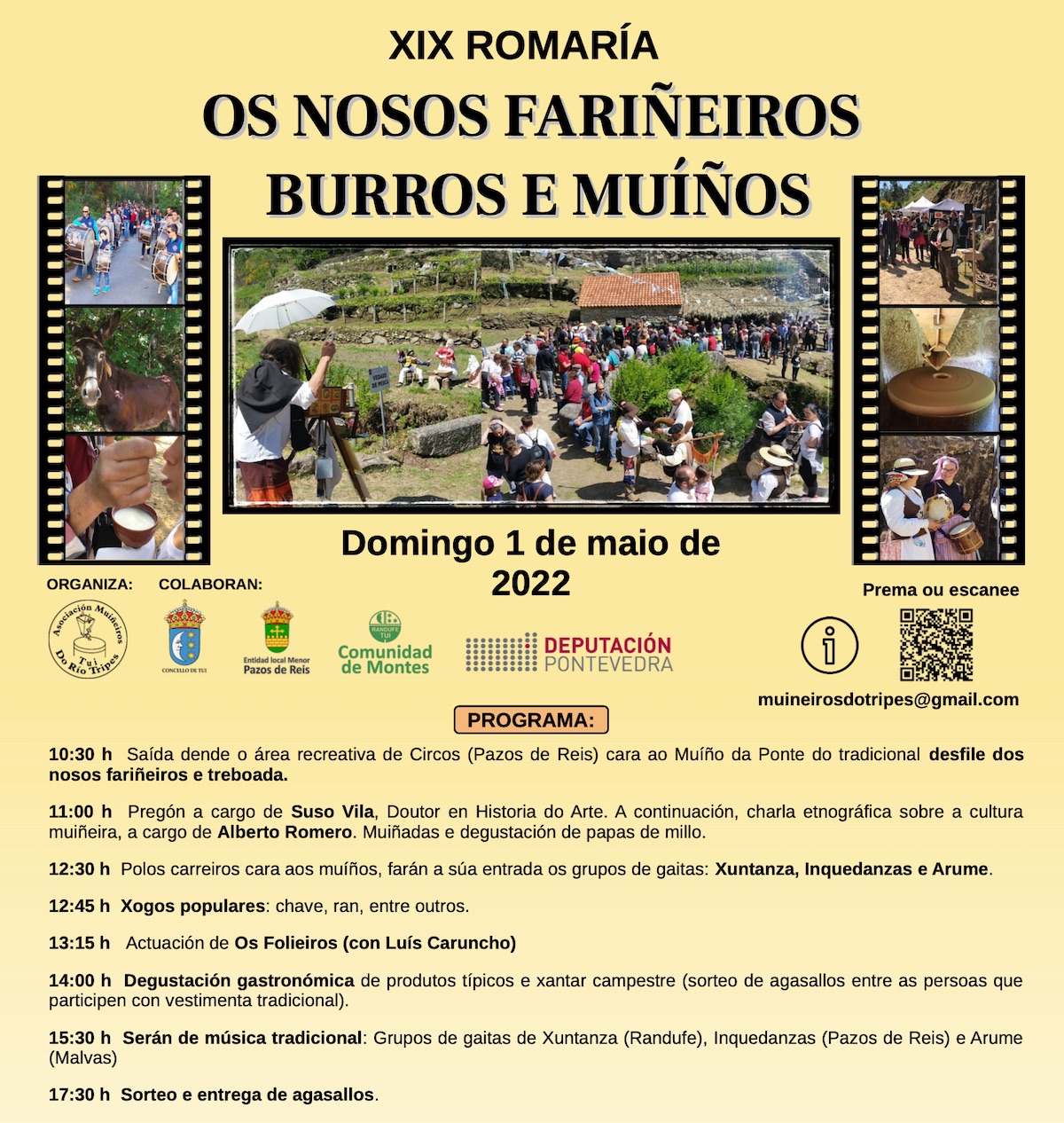 Durante toda la jornada habrá juegos populares, sorteo de regalos, puestos de artesanía y tres molinos en funcionamiento. Antes del almuerzo campestre, el grupo de música tradicional «Os Folieiros (con Luis Carcoma)» realizarán una actuación como paso previo al serán que tendrá lugar durante la tarde.
