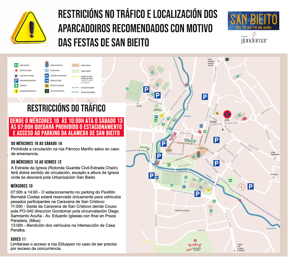 Con motivo de las Festas de San Bieito de Gondomar, se establecen restricciones al tráfico rodado del miércoles 10 al sábado 14 de julio principalmente en el entorno de la Iglesia.
