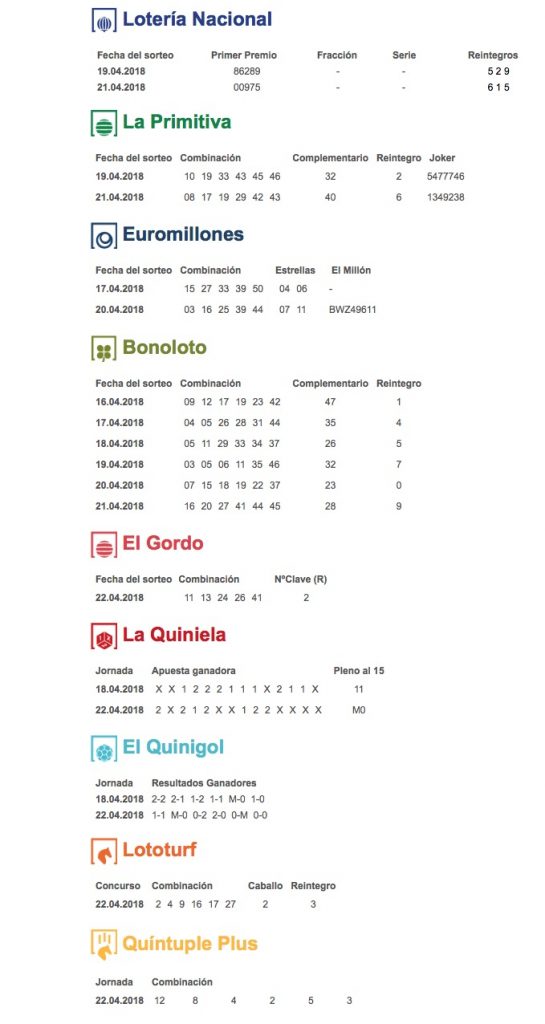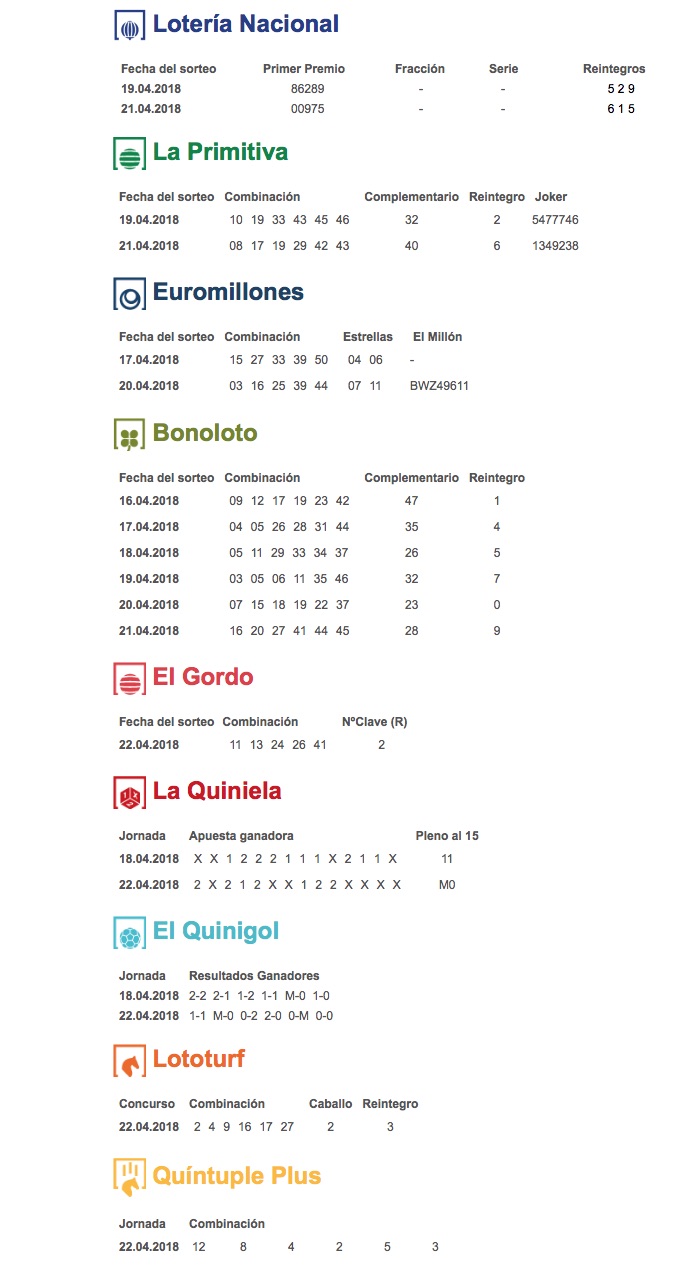 Resumen de los resultados de los sorteos de la Lotería Nacional, la Primitiva, la Euromillones, la Bonoloto, la Quiniela, el Gordo de la Primitiva, el Quinigol, la Lototurf y la Quíntuple Plus de la semana del 16 al 22 de abril.