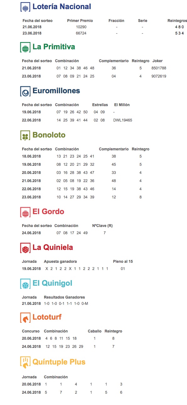 Inicio Oia Resultados de los sorteos de Loterías de la semana del 18 al... Oia Resultados de los sorteos de Loterías de la semana del 18 al 24 de junio Por Redacción - 26/06/2018 FacebookXWhatsAppTelegram Resumen de los resultados de los sorteos de la Lotería Nacional, la Primitiva, la Euromillones, la Bonoloto, la Quiniela, el Gordo de la Primitiva, el Quinigol, la Lototurf y la Quíntuple Plus de la semana del 18 al 24 de junio. El Tiempo Oia lluvia ligera enter location 15 ° C 15 ° 15 ° 100 % 5.7kmh 75 % Jue 15 ° Vie 19 ° Sab 16 ° Dom 17 ° Lun 17 °